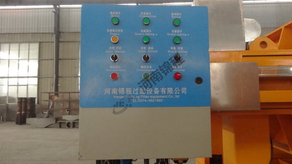 在液壓缸的作用下,壓濾機(jī)濾板沿主梁移動壓緊,使相鄰濾板間形成濾室,周邊密封。煤泥水經(jīng)人料泵以一定壓力從人料孔給人各濾室,借助人料泵的給料壓力在過濾介質(zhì)兩側(cè)形成的壓力差實現(xiàn)固液分離,煤泥顆粒滯留在濾室內(nèi),濾液透過過濾介質(zhì)從濾板的導(dǎo)水孔排出機(jī)外。經(jīng)過一段時間后,濾液不再流出,過濾脫水過程完成。停止入料,由鏈條拉開濾板,濾餅脫落后,由壓濾機(jī)下的刮板輸送機(jī)或膠帶機(jī)運走。